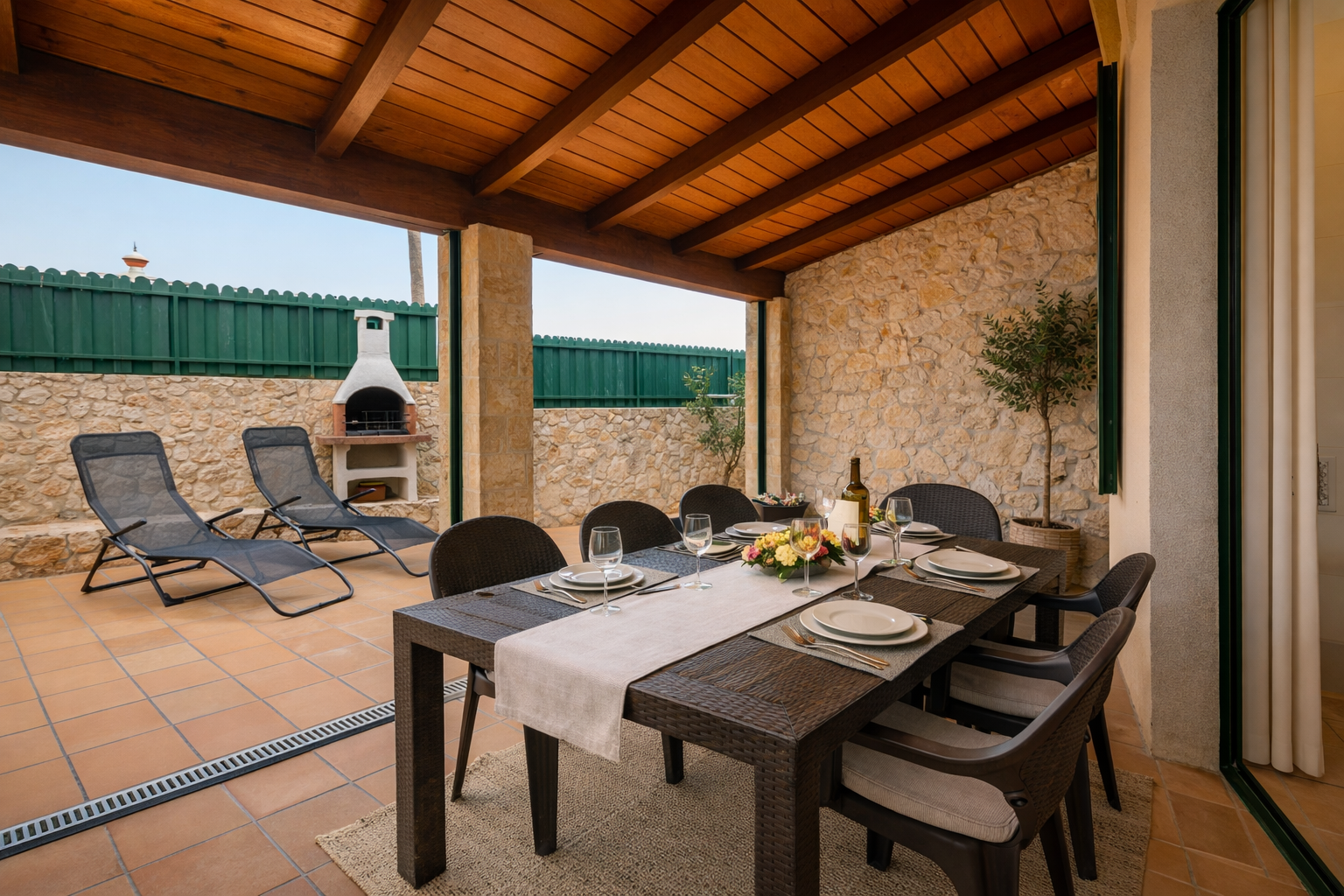 Grande Terrasse Aménagée pour profitez de moments conviviaux en famille sur lune terrasse abritée, idéale pour des repas en plein air et avec le barbecue.